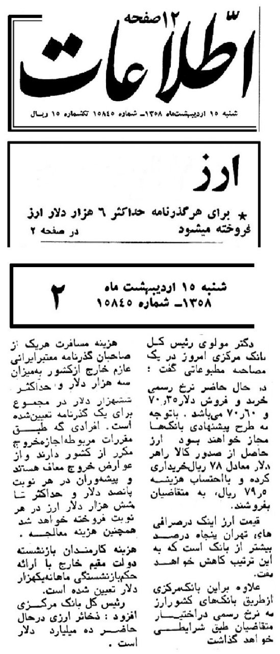 15 اردیبهشت 1358 ـ دو ماه و 23 روز پس از پیروزی انقلاب، دکتر مولوی رئیس وقت بانک مرکزی جمهوری اسلامی ایران در یک مصاحبه عمومی، بهای رسمی فروش دلار آمریکا را هفت تومان و شش قران اعلام کرد و گفت که بانک ها می توانند آن را تا 7 تومان و 9 قران و نیم بفروشند و صرّاف ها که بر حسب نرخ بازار (عرضه و تقاضا)، آن را ده تا 11 تومان می فروشند باید تعدیل کنند.