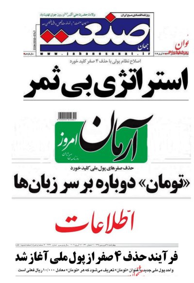 تیترهای صفحات اول شماری از روزنامه های تهران ـ شماره های 28 فروردین 1398 (17 اپریل 2019) باردیگر و برای چندمین بار از بهمن 1386 (دسامبر 2007) حکایت از تصمیم به حذف 4 صفر از پول کشور دارد. در سال 2007 پس از انتشار گزارش هایی که دولت لهستان می خواهد 4 صفر از اسکناس های خودرا حذف کند زیراکه پس از حذف نظام کمونیستی براثر چاپ بیش از حد پول کاغذی، حجم نقدینگی سرسام آور شده است، در تهران نیز سخن از حذف صفرها بمیان آمد که با انبوه اظهار نظرهای منفی روبه رو شد و پایان یافت. در آن زمان هر دلار آمریکا زیر نهصد تومان بود. در دیماه 1397 (ژانویه 2019) که قیمت ها و همچنین حجم نقدینگی افزایش بسیار یافته بود سخن از احتمال حذف صفرها و تبدیل ریال به تومان (که تومان از زمان ایلخانان مغول به سکه ها گفته می شد و بعدا در محاورات به هر ده ریال) تیتر روزنامه شد که باز اظهار نظر منفی در پی داشت و همّتی رئیس بانک مرکزی نیز گفته بود که خودمان هم می دانیم که حذف صفرها بی تأثیر است و تأثیری بر کاهش تورّم ندارد. این اظهارات همتی تیتر شماره پنجشنبه 20 دیماه 1397 روزنامه ها شده بود که تیتر دو روزنامه جهت یادآوری در زیر کپی شده است: