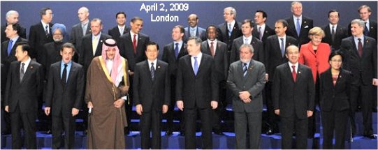 نشست دوم اپریل 2009 سران «19 دولت + مدیریت اتحادیه اروپا» در لندن که در میان تظاهرات ضد کاپیتالیستی و خشونت پلیس با تظاهرکنندگان آغاز شده بود به همین صورت هم در همان روز پایان یافت؛ و تنها چند ساعت طول کشید!. روسیه و رژیم پکن قبلا راه حل مسائل مالی جاری را جانشین کردن «دلار آمریکا» با سبدی از پولها اعلام کرده بودند، ولی در اعلامیه پایانی نشست اشاره ای به این نظرات نشده بود!. با موافقت نشست، منابع مالی صندوق بین المللی پول که غرب مبتکر آن است از 250 میلیارد دلار 750 میلیارد شد. کشورهای عضو گروه 20 عبارتند از: آرژانتین، آفریقای جنوبی، آلمان، استرالیا، انگلستان، اندونزی، ایالات متحده آمریکا، ایتالیا، برزیل، ترکیه، چین، روسیه، ژاپن، سعودی، فرانسه، کانادا، کره جنوبی، مکزیک، هند و مدیریت اتحادیه اروپا.