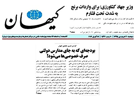 گوشه ای از صفحه اول شماره سی ام فروردین 1395 روزنامه کیهان وابسته به دفتر رهبری جمهوری اسلامی و انقلاب درباره مدارس غیردولتی*