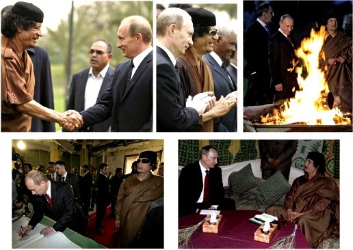 16 اپریل 2008 و در سالروز حمله حمله هوایی سال 1986 آمریكا به لیبی، ولادیمیر پوتین با هدف تحکیم رفاقت قدیمی مسكو با معمر قذافی برای یك دیدار دو روزه وارد لیبی شد و اعلام كرد كه روسیه و لیبی دارای منافع مشترك بسیار ازجمله در معاملات جهانی نفت و گاز و امور استراتژیک هستند. پوتین در این دیدار که در اخبار مربوط «بسیار صمیمانه» توصیف شده بود از بدهی 4 و نیم میلیارد دلاری لیبی به شوروی (سابق) به امید سرمایه گذاری ها و فروش های تازه صرف نظر کرد. این نخستین دیدار یك رهبر روسیه از لیبی بوده است. دیدیم که همین روسیه (که رئیس دولت آن هم ولادیمیر پوتین بود) در مارس 2011 قطعنامه غرب به شورای امنیت را که به این بلوک مجوّز مداخله نظامی در لیبی را داد «وتو» نکرد و باعث انهدام نظام حکومتی لیبی و قتل معمر قذافی شد و یک درس برای هر دولتمرد و ....