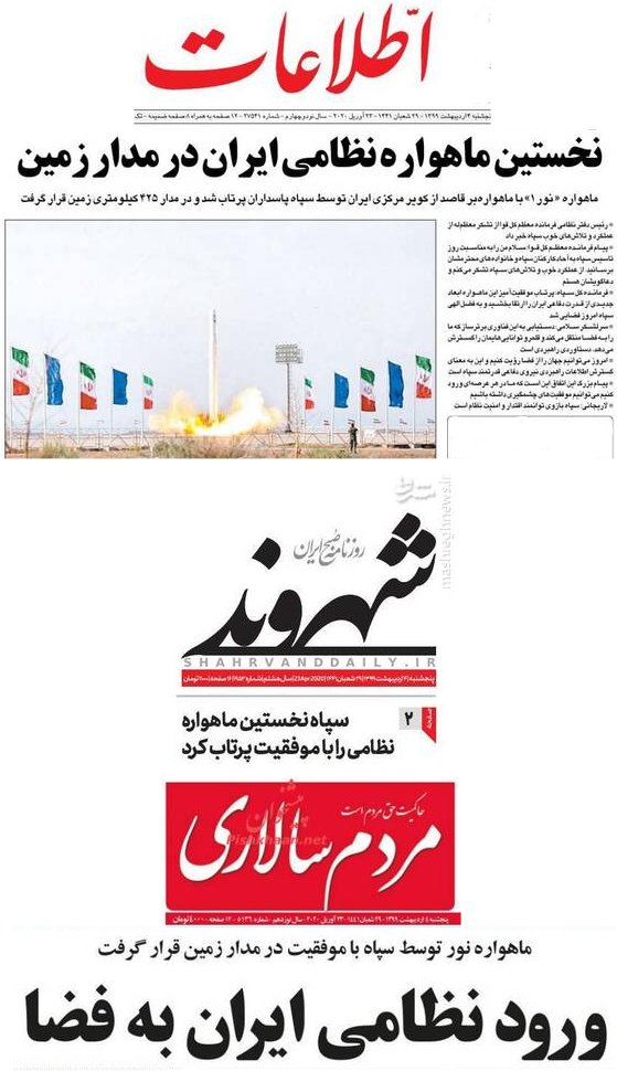 روزنامه های کشور تیتر چشمگیر صفحات اول شماره های پنجشنبه چهارم اردیبهشت 1399 خودرا به گزارش ماهواره نور اختصاص داده بودند. کُپی سه تیتر از سه روزنامه به عنوان نمونه: