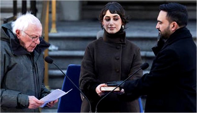 عکس، زُهران مَمدانی را در کنار بانویش با سوگند به قران مجید که به وعده هایش عمل خواهد کرد نشان می دهد. سناتور برنی ساندر رو به روی او ایستاده و وعده های ممدانی را که بر کاغذ نوشته به او یادآور می شود.