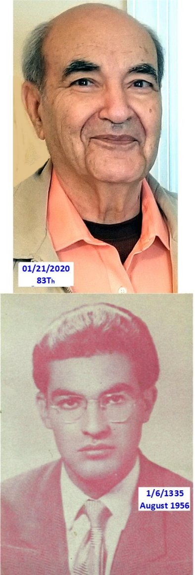 دو عکس از مؤلف این تاریخ آنلاین به فاصله 63 سال از هم (20 سالگی و آغاز کار روزنامه نگاری ـ 83 سالگی در 21 ژانویه 2020)