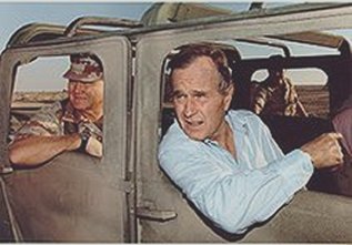 جورج بوش (پدر) و ژنرال شوارتسکوف عازم بازديد از نيروهاي نظامي آمريکا در کشور سعودي که آماده بيرون راندن عراق از کويت شده بودند