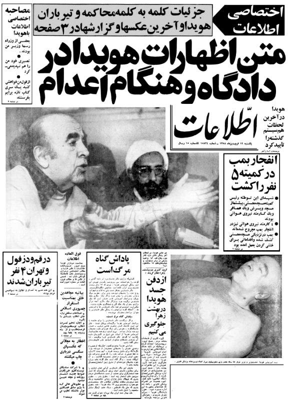 غروب شنبه هجدهم فروردین 1358 (در آن سال مصادف با هفتم اپریل 1979) امیرعباس هویدا که در دهه های 1340 و 1350 به مدت 12 سال و 6 ماه و 12 روز (از بهمن 1343 تا اَمُرداد 1356) نخست وزیر ایران بود در پایان دومین دور محاكمه اش در دادگاه انقلاب اسلامی به اعدام محكوم شد و حُكم، دقایقی پس از صدور در محوطه زندان قصر درباره او به اجرا درآمد و تیرباران شد و جسدش به تالار معاینه در پزشكی قانونی جهت صدور پروانه دفن انتقال یافت. دومین دور محاکمه هویدا ساعت 2 و 25 دقیقه بعد از ظهر شنبه هجدهم فروردین آغاز و چهار ساعت طول کشیده بود. در پایان جلسه محاکمه و یک ساعت شور اعضای دادگاه، حُکم دادگاه که اعدام و مصادره اموال هویدا بود اعلام و به او ابلاغ شد، هویدا 60 ساله بود. در آن زمان جلسات دادگاه در زندان قصر تشکیل می شد و هویدا در همین زندان بازداشت بود که در روز محاکمه اورا چشم بسته به محل دادگاه آورده بودند. روزنامه اطلاعات مشروح جلسه دادگاه را که توسط خبرنگار آن روی نوار ضبط شده بود پیاده کرده و در دو شماره نوزدهم و بیستم فروردین ماه 1358 این روزنامه انتشاریافته که سی دی آن در دسترس است.