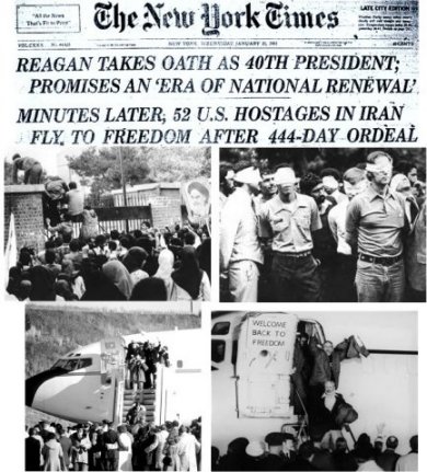 52 آمریكایی كه به مدت 444 روز در ایران به صورت گروگان بودند 21 ژانویه 1981 (یكم بهمن1359) وارد فرودگاه ویسبادن آلمان شدند. دولت ایران یك روز پیش از آن، و درست در روزی كه دوره ریاست جمهوری جیمی كارتر پایان یافت این گروگانها را كه در آبان 1358 در سفارت آمریكا در تهران دستگیر شده بودند رهاساخت. كارتر كه دیگر رئیس جمهور نبود از گروگانهای رها شده در آلمان دیدار كرد. این گروگانگیری به شكست كارتر در انتخابات انجامیده بود. جوانانی كه در آبان 1358 در تهران دست به این گروگانگیری زده بودند خواستار استرداد شاه جهت محاكمه او در تهران و نیز تعهّد آمریكا به قطع مداخلات خود در ایران بودند. در آن زمان شاه ظاهرا جهت درمان بیماری سرطان به آمریكا رفته بود. بلوكه كردن دارایی ها ایران و نیز اعلام دكترین كارتر در 23 ژانویه 1980 این گروگانگیری را پیچیده تر ساخته بود. طبق این دكترین كه بنظر می رسد همچنان نصب العین مقامات ارشد واشنگتن است، دولت آمریكا خودرا مجاز به استقرار در خلیج فارس كرده است. در دكترین كارتر آمده است: دولت آمریكا هرگونه تلاش برای كنترل منطقه خلیج فارس را تهدیدی برای منافع حیاتی خود تلقی خواهد كرد و برای عقب زدن و خنثی ساختن این تلاش به هر وسیله و اقدام متوسل خواهد شد. بهانه صدور این اعلامیه، مداخله مسكو در افغانستان [كه از خلیج فارس، فاصله زیاد دارد] بود!. این دكترین، به رغم فروپاشی شوروی، پابرجا مانده و آمریكا اینك نه تنها عملا در عراق، افغانستان، اردن، سعودی، كویت، بحرین، قطر و امارات حضور نظامی دارد و پاكستان متحد آن است بلكه جای پای آن در برخی كشورهای آسیای میانه و قفقاز هم دیده می شود.
