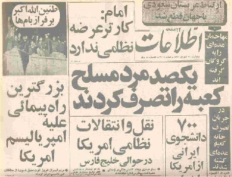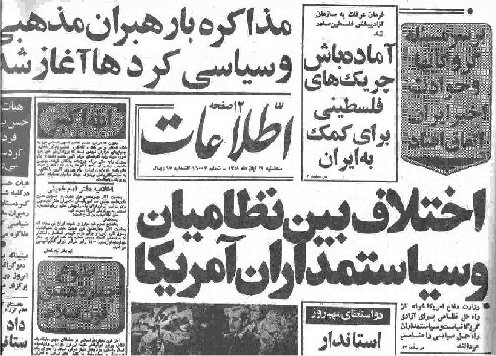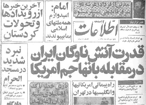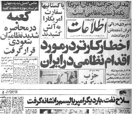 تهدید نظامی شدن مستقیم و غیر مستقیم جمهوری اسلامی ايران از نوامبر 1979 آغاز شد. در زیر، صفحات اول روزنامه اطلاعات ـ شماره هاي روزهای 29 و 30 آبان و یکم و سوم آذرماه 1358 (نوامبر 1979) آورده شده است که آغاز این فصل از «تاریخ» یادآوری شود [روز دوم آذرماه 1358 جمعه بود و این روزنامه جمعه ها منتشر نمی شد]: