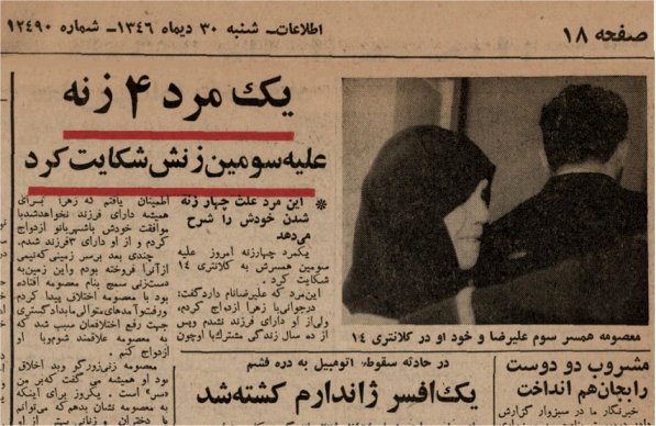 سی ام دیماه 1346 بود و اول وقت. من دبیر میر اخبار حوادث روزنامه اطلاعات بودم. خبرنگار میز که عهده دار پوشش اخبار پلیس و کلانتری های تهران بود از کلانتری 14 (میدان ژاله) تلفنی خبر داد که یک مرد 4 زنه از زن سومش به دادسرا شکایت کرده و دادسرا از کلانتری خواسته که در زمینه شکایت تحقیق کند و آن زن و پرونده را به دادسرا بفرستد و ایندو اینجا هستند. من با هر دو در حضور هم مصاحبه کرده ام و به خاطر تنبّه جامعه و اینکه دیگران به راهی که آنان رفته اند گام نگذارند حاضر به گفت و گو با من شده اند.