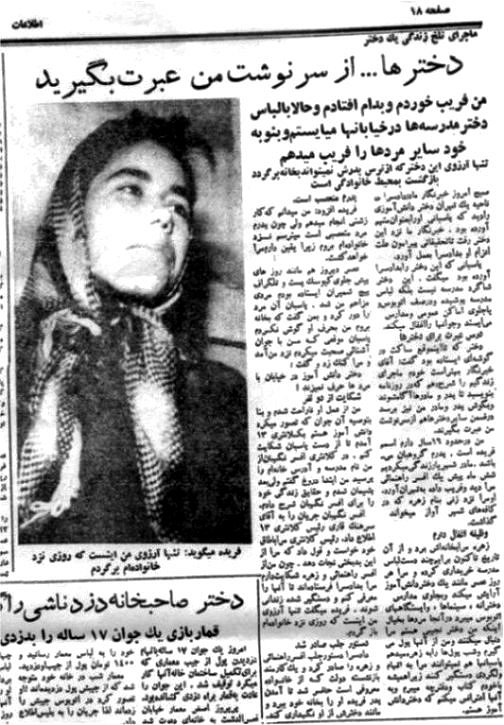 فروردین ماه 1350 (اپریل 1971) بود و من (این نگارنده ـ نوشیروان کیهانی زاده) معاون وقت سردبیر روزنامه اطلاعات و مسئول میزهای اخبار حوادث شهری ـ قضایی، فرهنگی و گزارش روز (فیچِر) بودم که آخر وقت سومین شنبه این ماه، خبرنگار قضایی روزنامه اطلاعات، از دادسرای تهران ماجرای جالب و کم سابقه ای را گزارش کرد که قرار شد بماند برای درج در شماره روز بعد. ماجرا به قدری جالب بود که پیش از اِدیت، و به نام تکمیل مطلب و یافتن جزئیات، به اتفاق خبرنگار رهسپار دادسرا شدم که تا ساختمان مؤسسه اطلاعات چند صد قدم بیش فاصله نداشت. هنوز عامل ماجرا آنجا بود و تحقیق از او ادامه داشت. زنش از او شکایت کرده بود. شوهر 38 ساله و زنش 21 ساله بود. دو طرف به این شرط که نام و نشانی آنان درج نشود حاضر به مصاحبه شدند. شوهر در اطاق منشی بازپرس بود و زنش در کنار پدر خود در راهرو روی نیمکت نشسته بود.