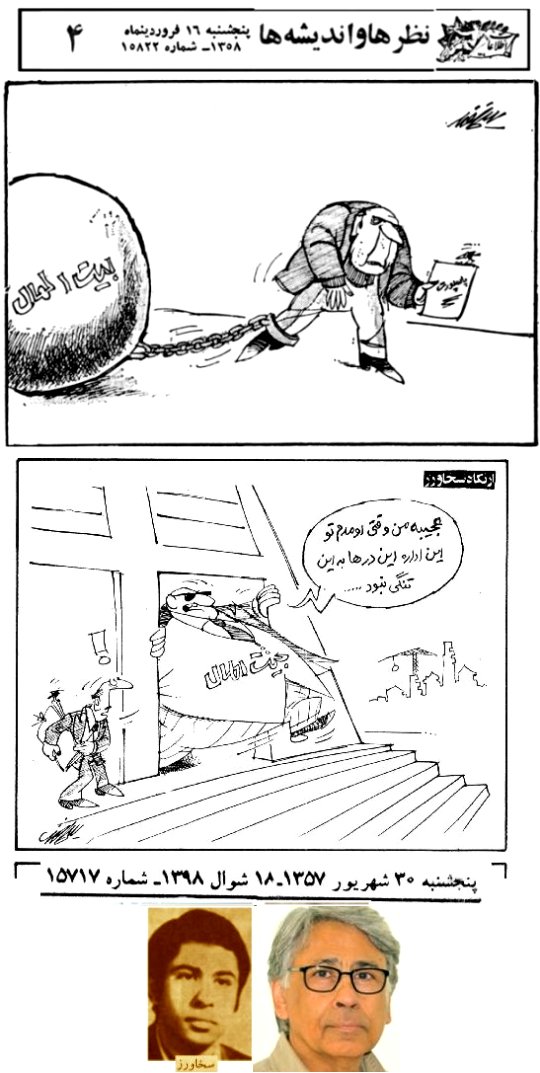 دو نمونه از کاریکاتورهای ژورنالیستی سخاورز، درج شده در صفحه ششم روزنامه اطلاعات 5 ماه پیش از تغییر نظام ایران و دو ماه پس از تغییر نظام