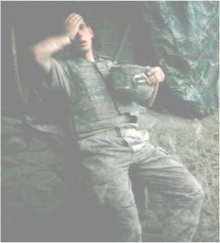 این عكس كه 16 سپتامبر 2007 توسط یك عكاس انگلیسی برای مجله «ونیتی فِر» گرفته شده است یك نظامی خسته آمریكایی را در محل غار مانندی در Korengal افغانستان نشان می دهد كه پس از ساعت ها ماموریت گشت در كوهستان، به آن صورت خواسته بود دَمی را بیاساید.