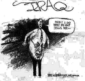 یكی از كاریكاتورهای برگزیده سال 2004 توسط «مایك لوكوویچ » كاریكاتوریست آمریكایی ترسیم شده بود. این كاریكاتور؛ دیك چنی معاون جورج دبلیو بوش را در شكم او نشان می دهد و بوش در مورد مشكلات عراق می گوید: حقیقت این است كه هرچه درونم بگوید! انجام می دهم (از درون خود الهام می گیرم) یعنی كه هر چه را «چنی» بخواهد و دیکته کند می نویسم!.