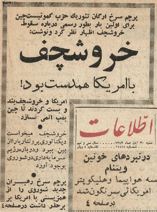 در زیر گوشه ای از صفحه اول شماره 30 آبان 1343 (21 نوامبر 1964) روزنامه اطلاعات (چاپ تهران) درج شده است که نشان می دهد چینِ نوامبر 2018 تا چه حد نسبت به روسيه تغییر نظر و وضعیت داده است و در ويتنام ـ زمانی در حال جنگ و بمباران شدن، آرامش برقرار است: