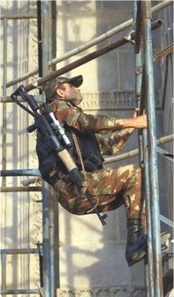 يک کماندوي هندي به اين صورت خودرا به پشت بام هتل مي رساند