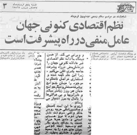 سردبير روزنامه اطلاعات اظهارات شاه در سلام نوروزي سال 1357 را به صفحه سوم اين روزنامه برده بود که جملات انتقادي او از نظام اقتصادي جهان که اين نظام به همان صورت و همچنان ادامه دارد کپي شده است