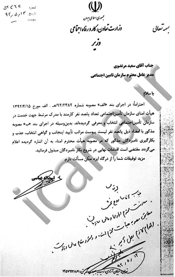 خبرگزاری مجلس (ایکانا) بیست و چهارم آذرماه 1392 کُپی سه سند مربوط به استخدام همشهریان و آشنایان(Nepotism) در سازمان تامین اجتماعی به دستور اسدالله عباسی و در دوران مدیریت عامل سعید مرتضوی (دادستان پیشین تهران) را در وبسایت خود قرار داد تا ثابت شود که تکذیب اسدالله عباسی (وزیر تعاون، کار و رفاه اجتماعی در دولت دهم ـ دولت محمود احمدی نژاد) در مورد استخدام 500 تن برای سازمان تامین اجتماعی و بدون طی مراحل قانونی استخدام (انتشار آگهی استخدام، رعایت شرایط و گزینش برحسب تحصیلات و تجربه و انتخاب برترها از میان متقاضیان) نادرست بوده است.