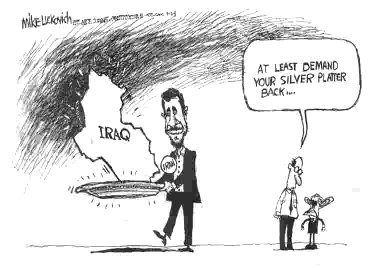«مایك لوكویچ» كاریكاتوریست آمریكایی برپایه گزارش و تفسیر رسانه ها درباره گسترش نفوذ ایران در عراق (پس از صدام حسین) و اینكه ظاهرا «ایران» برنده شماره جنگ پُرتلفات و پُرهزینه آمریكا با عراق بوده است؛ این كاریكاتور را ترسیم و به روزنامه ها فروخته بود. كاریكاتور نشان می دهد كه جورج بوش (رئیس جمهور وقت آمریکا) عراق را در یك بشقاب نقره ای گذارده و به احمدی نژاد پیشکِش كرده است!. فردی با تعجب به بوش (كه با گوشهای بزرگ و به حالت كابویی قراردادن دست ها مشخص شده است) می گوید كه دست كم تقاضاكن (كه تا احمدی نژاد دور نشده) بشقاب نقره ای ات را بازگرداند!.