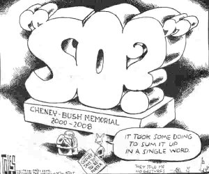این كاریكاتور باتوجه به پاسخ های «دیك چنی» معاون رئیس جمهور وقت آمریكا به یك گزارشگر تلویزیونی ترسیم شده بود. این گزارشگر پرسیده بود كه آمریكاییان مشكلات جاری (سال 2008) خودرا نتیجه جنگ عراق می دانند كه چهار هزار كشته و نزدیک به یك تریلیون (هزار میلیارد) دلار هزینه داشته كه سهم هرآمریكایی از آن بالغ بر سی هزار دلار است، در این باره چه نظری دارد؟. «چنی» با بالا انداختن ابرو، در پاسخ، به گفتن یك كلمه اكتفا می كند كه نشانه نوعی بی اعتنایی او به پرسش بود و آن كلمه چند معنایی «SO سو؟!» است و در اینجا به معنای: خوب! دیگه چی، شده كه شده .... كاریكاتوریست شكل بنای یادبود بوش ـ چنی را در طول هشت سال زمامداری در قالب كلمه دو حرفی «سو SO» ترسیم كرده است.