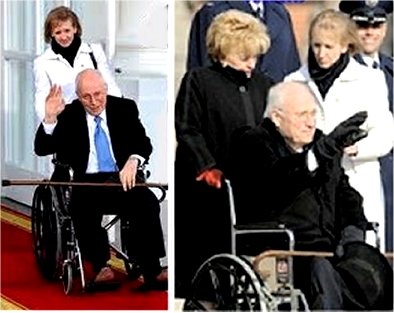 دیک چنی که برخی از رسانه های آمریکا اورا مغز متفکر دولت جورج بوش می نوشتند بیستم ژانویه 2009 با ویلچر در مراسم تحلیف «باراک اوباما» رئیس جمهور چهل و چهارم شرکت کرده بود (عکس زیر). بانوی چنی که با او در مراسم شرکت کرده بود علت ویلچر نشینی شوهرش را بلندکردن اشیاء شخصی! هنگام تخلیه اقامتگاه اختصاصی معاون رئیس جمهور بیان کرده و گفته بود که پزشگ توصیه کرده است تا مدتی با ویلچر حرکت کند.