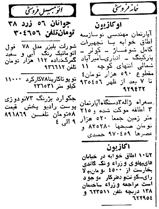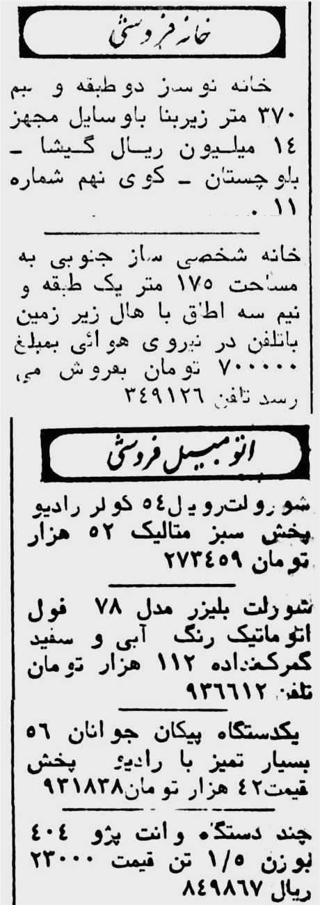 نگاهی به آگهی های این شماره از روزنامه اطلاعات که در آن زمان، مؤلف این تاریخ آنلاین دبیر میز اخبار بین الملل آن بود، بهای اتومبیل و خانه در اسفندماه 1357 را نشان می دهد که از مقایسه آن ارقام با ارقام سال جاری، تفاوت کهکشانی قیمت ها به دست می آید که با بررسی، علل افزایش آن و همچنین راههای جلوگیری از ادامه افزایش. چند نمونه از این آگهی های کوچک کلاسه شده معروف به نیازمندی ها: