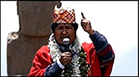 مورالس در کسوت رئيس قبيله بومیان (اصطلاحا؛ سرخپوستان) بوليوي