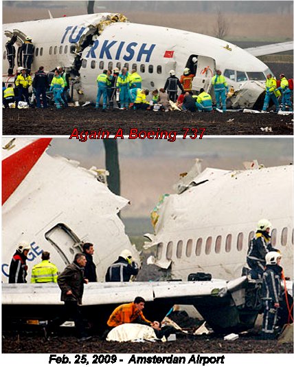 25 فوریه 2009 یک بوئینگ مسافربر دیگر از نوع 737 دچار سانحه شد و تلفات انسانی به بار آورد. این هواپیما متعلق به شرکت هواپیمایی ترکیه بود و از استانبول روانه آمستردام. هواپیما هنگام فرودآمدن، درحاشیه فرودگاه آمستردام به زمین برخوردکرد و سه قطعه شد (عکس های بالا). یک موتور این هواپیما قبلا از بدنه اش جدا شده بود. از 134 سرنشین این هواپیما 9 نفر کشته و بیش از 80 نفر دیگر مجروح شدند. خالی بودن نسبی مخازن بنزین هواپیما دلیل کم بودن تلفات اعلام شده است زیرا که هواپیما پس از اصابت به زمین آتش نگرفت. علت سانحه در روز وقوع آن اعلام نشده بود. در دو سه دهه اخیر، درصد سقوط بوئینگ های 737 نسبت به انواع دیگر هواپیما بیشتر بوده و در کمتر از دو دهه بیش از ده سانحه داشته است. بوئینگ 737 در سال 1967 وارد خطوط هواپیمایی شده است. ساخت این نوع هواپیما در همین سال تکمیل شده بود. کارخانه بوئینگ آمریکا از سال 1916 بکار ساختن هواپیما اشتغال داشته است.