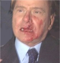 در سال 2009 در میلان مردی بر صورت برلوسکونی یک مجسمه کوچک سیمانی کوبید و اورا مجروح ساخت و به بیمارستان فرستاد. این رویداد باعث شد که رسانه ها در گوشه و کنار جهان سابقه کارهای اورا بر گزارش مجروح شدنش بیافزایند و منعکس سازند و باردیگر تردید به دمکراسی ایتالیایی که پس از جنگ جهانی دوم در چند مورد، دولت سوسیالیست داشته موضوع روز شود و ایتالیایی ها به بی توجهی به تکلیف مهم و حسّاس رای دادن متهم شوند. گزارش های مربوط به برلوسکونی در رسانه ها همراه با عکس هایش با زنان زیبا منتشر می شود.