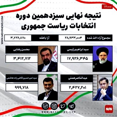 نتایج نهایی شمارش آراء و انتخاب ابراهیم رئیسی به ریاست جمهور که اعلام کرد دولتی انقلابی و ضدِ فساد تشکیل خواهد داد