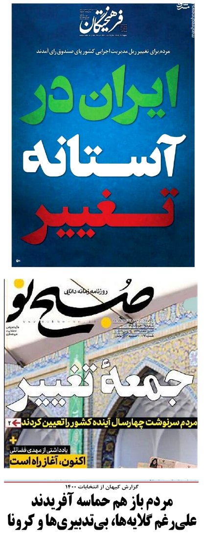 صفحات اول 29 خرداد 1400 سه روزنامه تهران که تیترهای دوتای آنها روایت از تغییر (در دوران دولت بعدی ـ دولت منتخب انتخابات خرداد 1340) دارد: