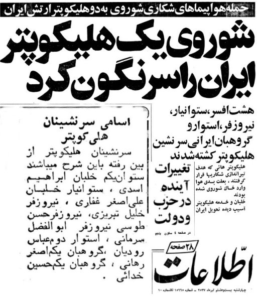28 تیرماه 1357 (سال انقلاب) اعلام شد که دو هلی کوپتر ارتش ایران که در آسمان شمال خراسان پرواز می کردند به سبب ابری و توفانی شدن ناگهانی هوا مسیر خود را گم کردند و ندانسته وارد فضای اتحاد جماهیر شوروی سوسیالیستی شدند و مورد حمله جنگنده های این جماهیریه قرار گرفتند و هر دو گلوله خوردند، یکی از آنها منهدم شد و همه سرنشیانش کشته شدند و دیگری که آسیب دیده بود در همانجا فرود آمد و سرنشینان آن دستگیر شدند و گفته شده است که به ایران تحویل داده خواهند شد.