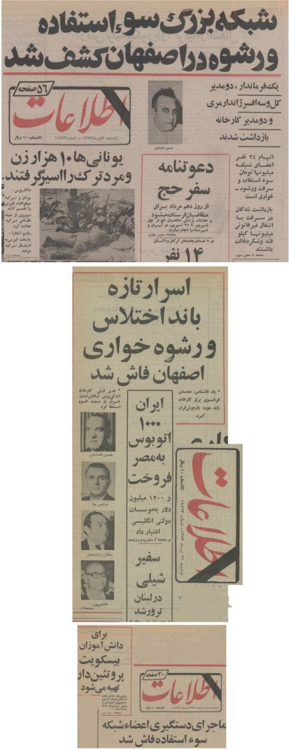 در زیر گوشه هایی از صفحات اول روزنامه اطلاعات شمارهای 30 و 31 تیرماه و یکم اَمُردادماه 1353 به عنوان سند کُپی شده است: