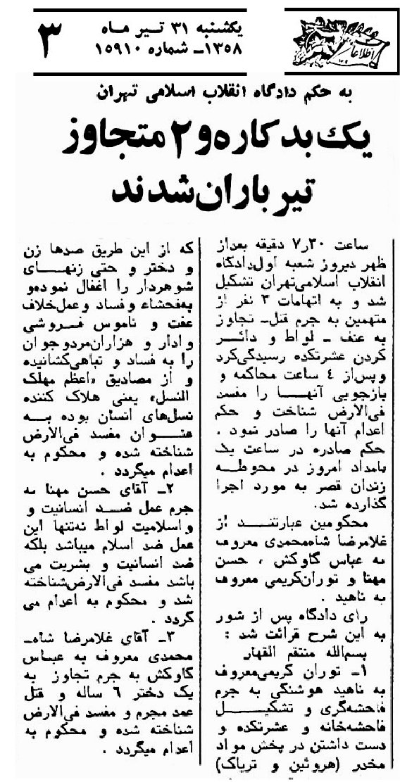 کُپی گزارش 3 اعدام انقلابی از شماره 31 تیرماه 1358 روزنامه اطلاعات، 5 ماه و 8 روز پس انقلاب برای ماندن در تاریخ