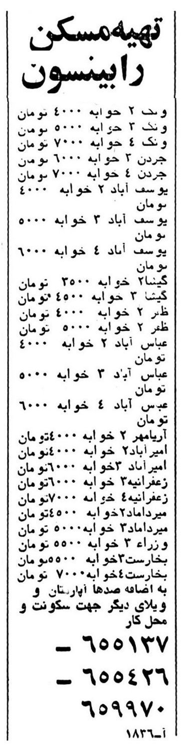 کُپي آگهي يک بنگاه مَسکَن در صفحه ششم شماره 15770 روزنامه اطلاعات منتشرشده در هشتم بهمن ماه 1357 (دو هفته پيش از پيروزي انقلاب):