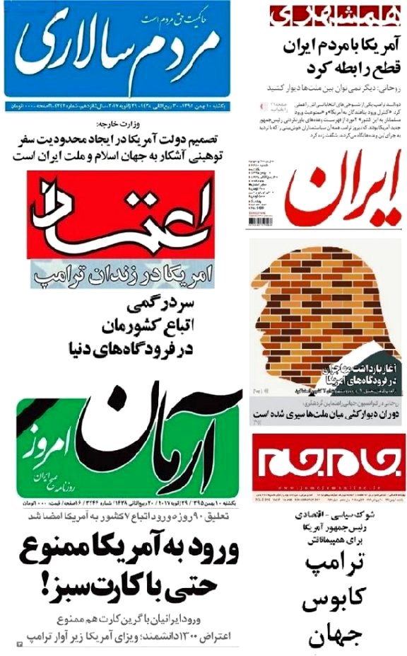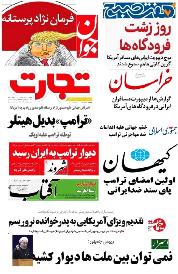 صفحات اول شماره های یکشنبه دهم بهمن ماه 1395 روزنامه های تهران (که در زیر کاپی شده اند) تماما بویژه نشريات معروف به اصلاح طلبان در انتقاد از این دستور العمل بودند. برخی نوشته بودند که عاملان حوادث 11 سپتامبر 2001 از اتباع سعودی و امارات عربی متحده بودند ولی اتباع این کشورها مشمول منع ورود قرار نگرفتند. فعالیت القاعده و طالبان آمریکایی کُش در افغانستان است ولی اتباع این دولت مشمول این بخشنامه نیستند!.