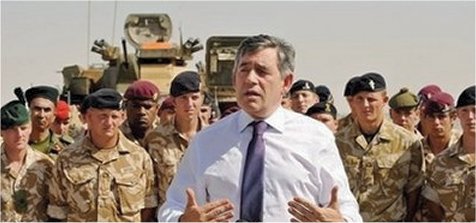 جیمز گوردون براون نخست وزیر وقت انگلستان نخستین مقامی بود که استراتژی اعلام شده «اوباما» در مارس 2009 در قبال افغانستان و پاکستان را تایید کرد و مورد حمایت قرارداد و وعده داد که نظامیان بیشتری به افغانستان خواهد فرستاد.به باور برخي، انگلستان بانی همه مسائل افغانستان از آغاز قرن نوزدهم و ایجاد این کشور از تجزیه ایران بوده است و از فعالیت هایی که به عمل می آورد ازجمله از طریق بی بی سی چنین بر می آید که سیاست قدیمی خود در قبال این سرزمین را تغییر نداده است. براون (دکتر در تاریخ و آشنا به حرفه ژورنالیسم که مدتی فعالیت تلویزیونی داشت) از زمان روی کار آمدن ـ بیش از تونی بلر نخست وزیر قبلی به امور عراق و افغانستان علاقه نشان می دهد. این عکس، اورا در آگوست 2008 هنگام دیدار از واحدهای نظامی انگلستان در منطقه قندهار افغانستان نشان می دهد که دارد برای این نیروها سخنرانی می کند.